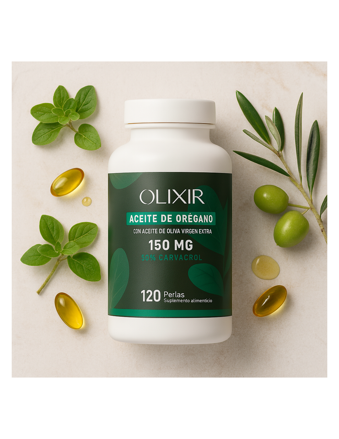 Olixir Aceite de Orégano 150 mg - 50% Carvacrol Natural con Aceite de Oliva Virgen Extra - 120 Perlas