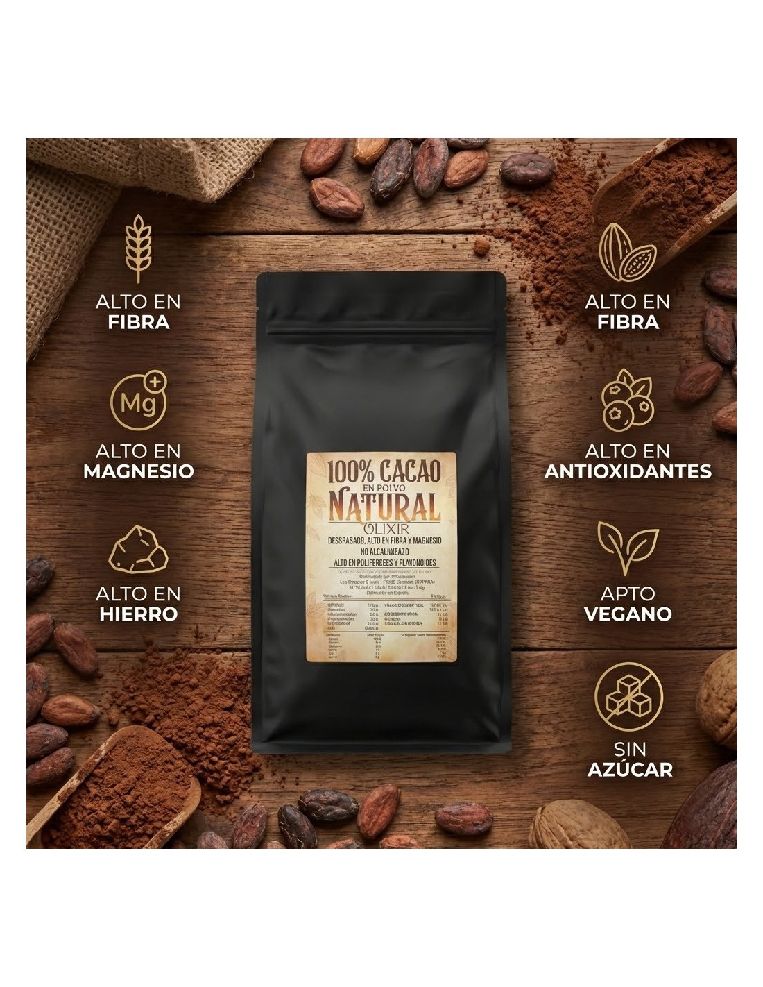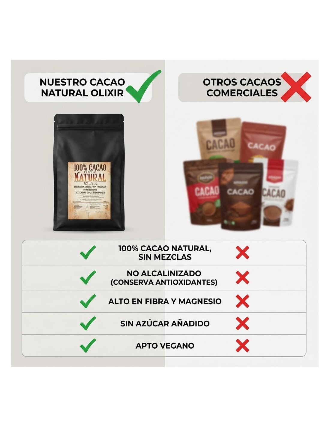 Olixir- Sabor auténtico y aroma profundo: Cacao puro no alcalinizado con un perfil aromático natural y equilibrado. Mantiene su sabor real gracias a su mínima intervención, ideal para quienes buscan un cacao intenso y auténtico sin amargor excesivo.