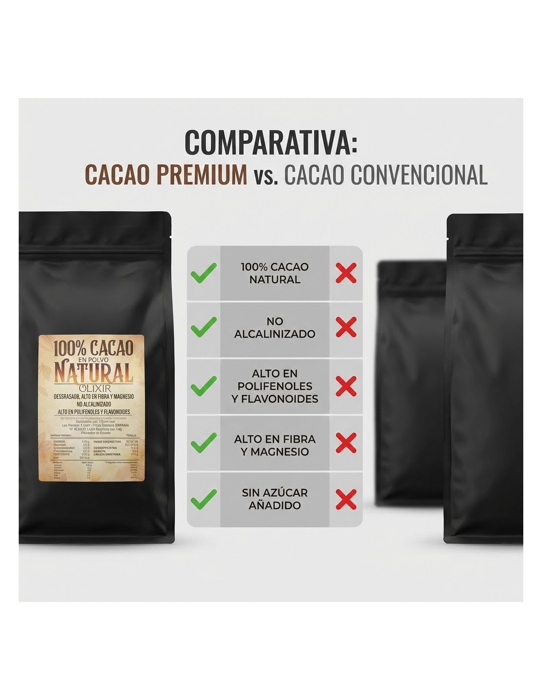 Una Bomba de Antioxidantes (¡sin filtro!): Cuando el cacao no se "lava" (alcaliniza), mantiene intactos sus superpoderes: los antioxidantes. Son como pequeños soldados que protegen tus células del envejecimiento y de enfermedades. Al acostumbrarte al sabor puro, ¡estás recibiendo una dosis máxima de este escudo protector!