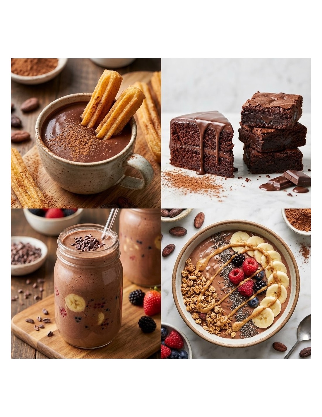 Toppings y Salsas: Espolvorea sobre frutas, helados o prepara salsas de chocolate saludables. Aporta un sabor excepcional, un color vibrante y una profundidad aromática que transforma cada preparación en una experiencia gourmet.