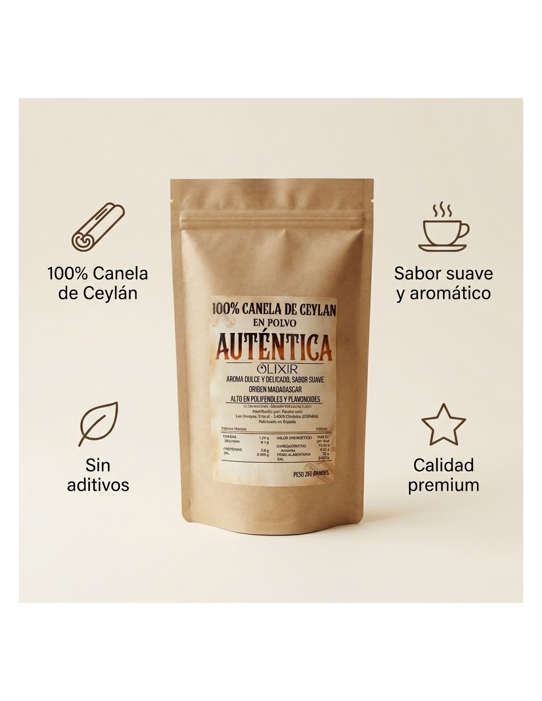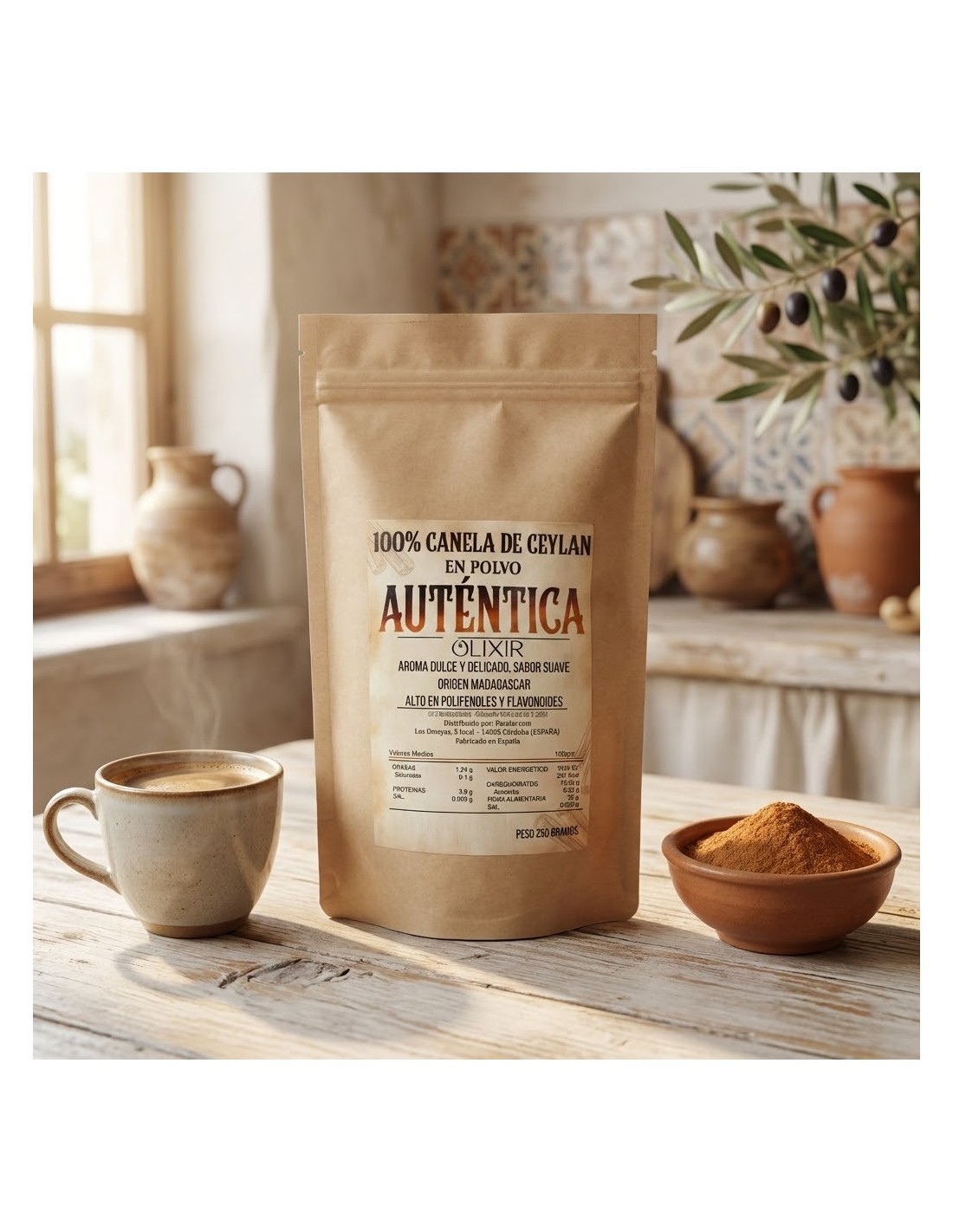 La Canela de Ceylán en Polvo Olixir procede de Cinnamomum verum, conocida como la canela verdadera. Cultivada en Madagascar de forma ecológica, sin pesticidas ni químicos, y molida cuidadosamente, destaca por su aroma suave, sabor delicado y alta calidad.