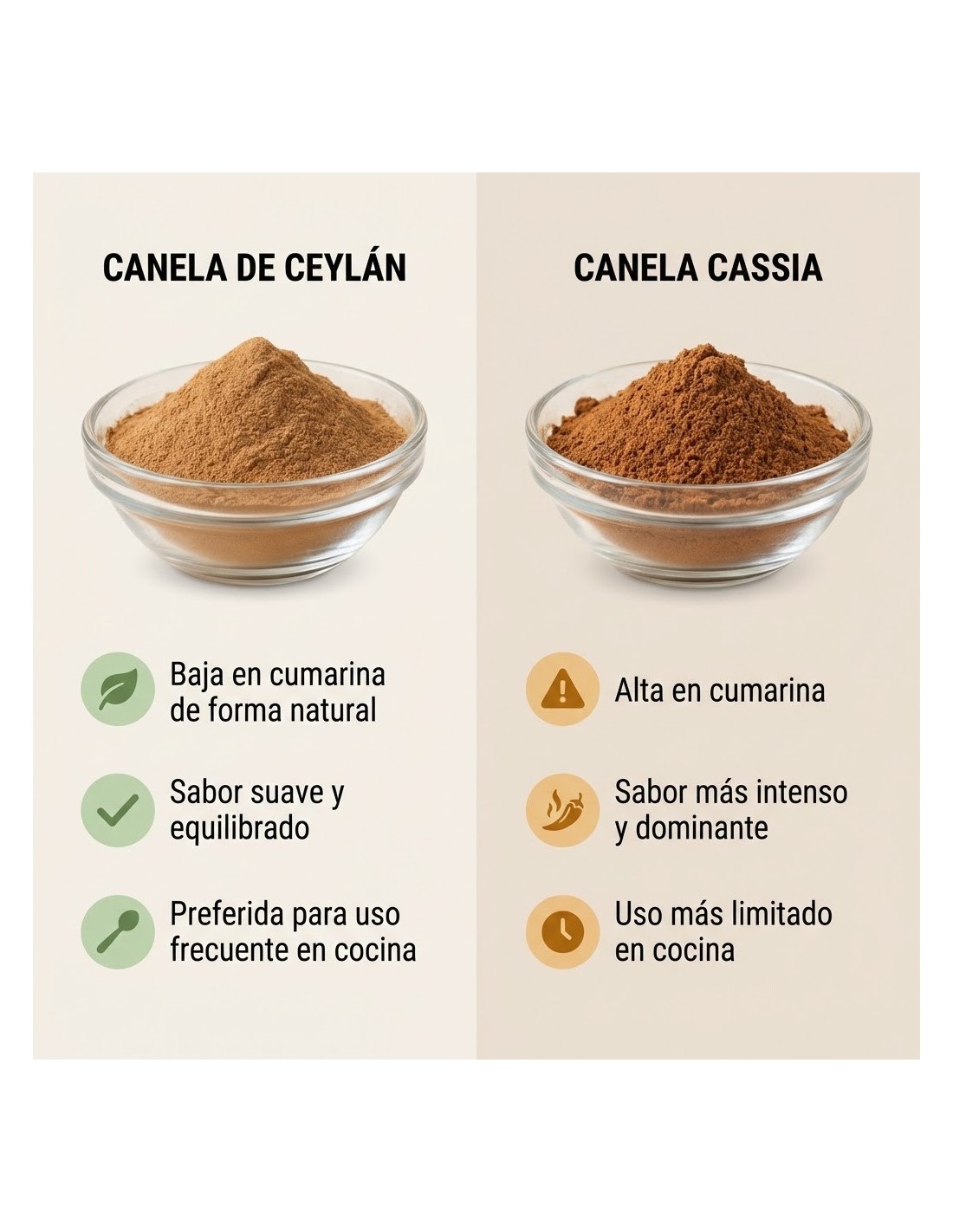 Su sabor es más fino y menos picante que otras canelas, lo que permite usarla tanto en recetas dulces como saladas sin enmascarar otros ingredientes.