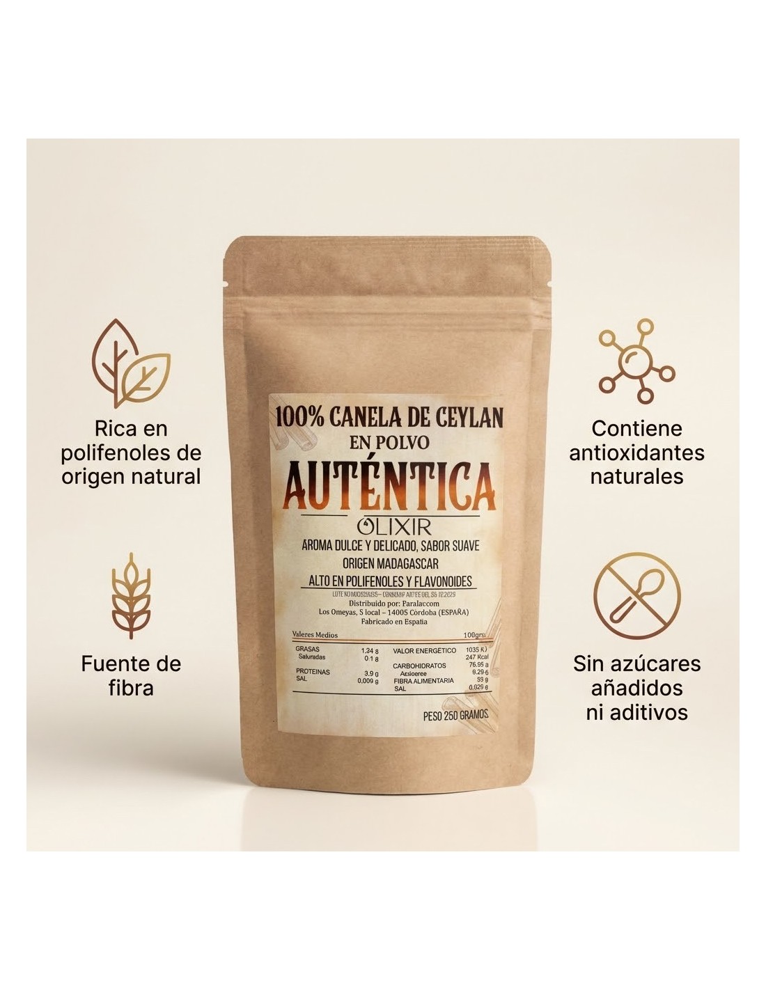 De forma natural, la canela de Ceylán es alta en fibra y contiene polifenoles, compuestos vegetales presentes en muchos alimentos de origen vegetal. Su perfil nutricional la hace ideal para integrarla en una alimentación variada y equilibrada.